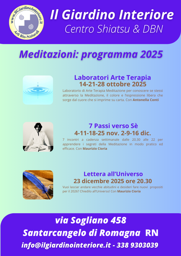 Ecco il Programma delle serate e dei Percorsi di Meditazione in calendario per il 2025 Tutte le serate si svolgeranno il Martedì dalle ore 20.45su prenotazione e prevedono un contributo di partecipazione a seconda del tipo di percorso.info e prenotazioni 338 9303039 – info@ilgiardinointeriore.it